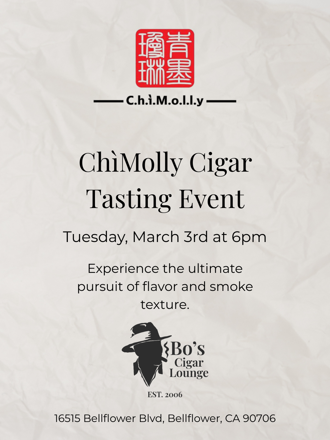 Join us, Tuesday, March 2, for a tasting event with Chìmolly Cigars.